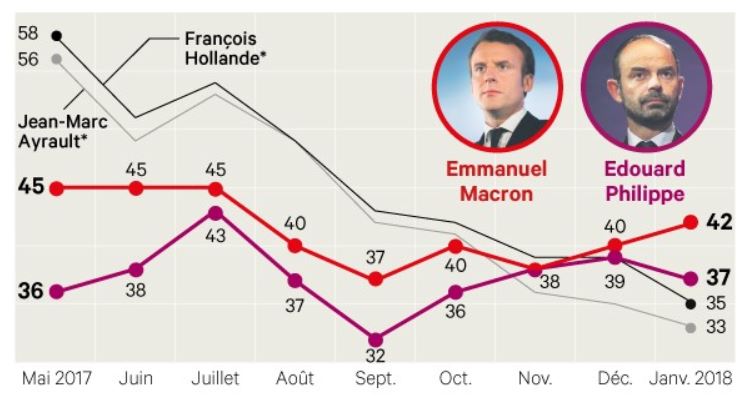 Les Echos紙にとても見やすいグラフが掲載されていたので、こちらにご紹介いたします。このグラフは調査会社Elabeによるもので、昨年5月から年明けにかけてのマクロン大統領とフィリップ首相の支持率を示しています。前政権と比較できるようにオランド前大統領とエロ―元首相の政権発足時の支持率の推移(下記グラフの黒字の線)も表示されています。